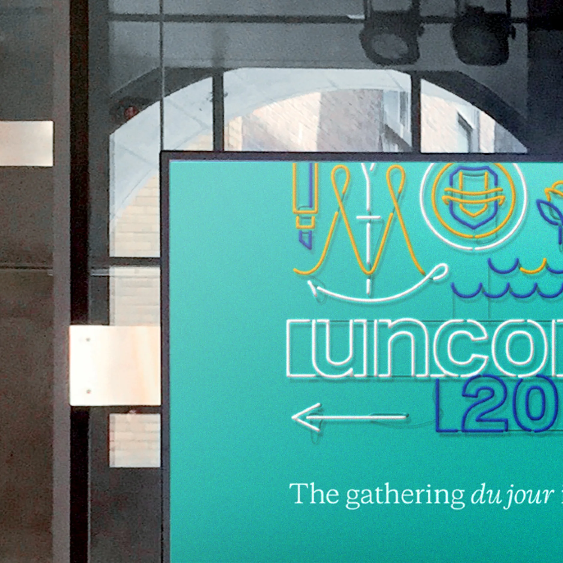 The solve: Mash it together and light it up. To mirror Montréal's varied culture, we tiled imagery and text over uneven surfaces and as wall-to-wall murals for an eclectic visual landscape. Typography toggled back and forth between English and French. A modernized family of emblems depicted different facets of the city's identity, while the core emblem came to life as an actual lighted sign that traveled from venue to venue. "Neon" illustrations spoke to "illumination" and the buzzing energy of the city. Design included: creative concept, logo and emblems, all of the environmental graphics, digital marketing, screen displays, and printed collateral. Direction included: website, digital marketing, app, social media, printed collateral, badge and lanyard, menus, giveaway packaging, animation, and on-site installation. Note: Liz Borchert and Mandy Chen provided additional design support on giveaways and animations. Created at Thinkso.